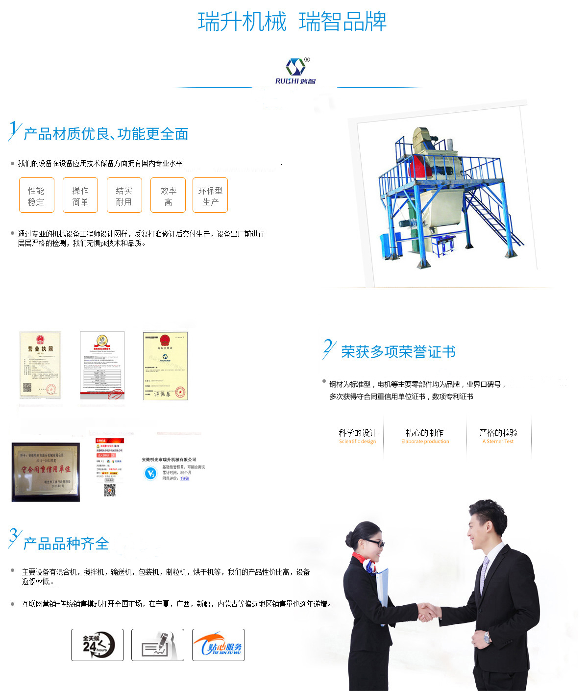安徽瑞升機(jī)械制造有限公司坐落在明光市工業(yè)園區(qū),本公司產(chǎn)品主要用于粉料物質(zhì),顆粒物質(zhì)的混合、攪拌、輸送、包裝的自動(dòng)化生產(chǎn)設(shè)備。工廠占地面積為1萬(wàn)多平方現(xiàn)有6000平方米的生產(chǎn)車間和各類加工檢測(cè)設(shè)備,具備產(chǎn)品開發(fā)、研制、設(shè)計(jì)、生產(chǎn)、試驗(yàn)、倉(cāng)儲(chǔ)運(yùn)輸?shù)饶芰Γ梢陨a(chǎn)多種規(guī)格、多種非標(biāo)定制的產(chǎn)品,并有多項(xiàng)技術(shù)獲得國(guó)家專利,擁有自主進(jìn)出口權(quán),公司憑借優(yōu)良的技術(shù)、先進(jìn)的工藝和科學(xué)的管理理念,所生產(chǎn)的產(chǎn)品已暢銷全國(guó)各地,部分產(chǎn)品已進(jìn)入馬耳他、印度尼西亞、韓國(guó)、羅馬尼亞、沙特阿拉伯、馬來(lái)西亞、印度、巴基斯坦、等國(guó)家和地區(qū),受到國(guó)內(nèi)外客戶的高度認(rèn)可和信賴。 本公司獲得守合同重信用單位證書,對(duì)原材料的采購(gòu)極為細(xì)致,鋼材為標(biāo)準(zhǔn)型,電機(jī)等主要零部件均為品牌,數(shù)項(xiàng)專利證書。技術(shù)方面我司擁有一支國(guó)內(nèi)的技術(shù)和管理團(tuán)隊(duì),在機(jī)械設(shè)備應(yīng)用...公司資質(zhì)榮譽(yù)